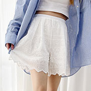【SB9457】腰鬆緊鏤空布蕾絲波邊短裙褲.白色M(現貨)