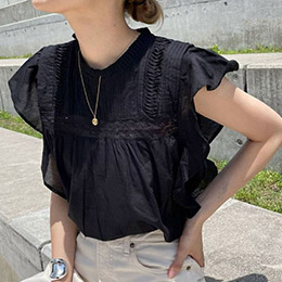 Ungrid褶邊立領鏤空蕾絲荷葉袖棉衫