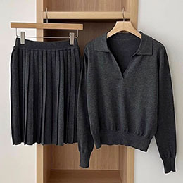 韓國空運-混羊毛翻領針織衫+百褶裙套裝 韓國製