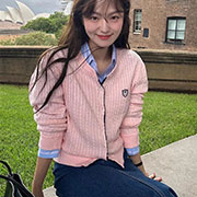 【SB9895】刺繡印花撞色邊針織珠光排釦衫.粉色 (現+預)